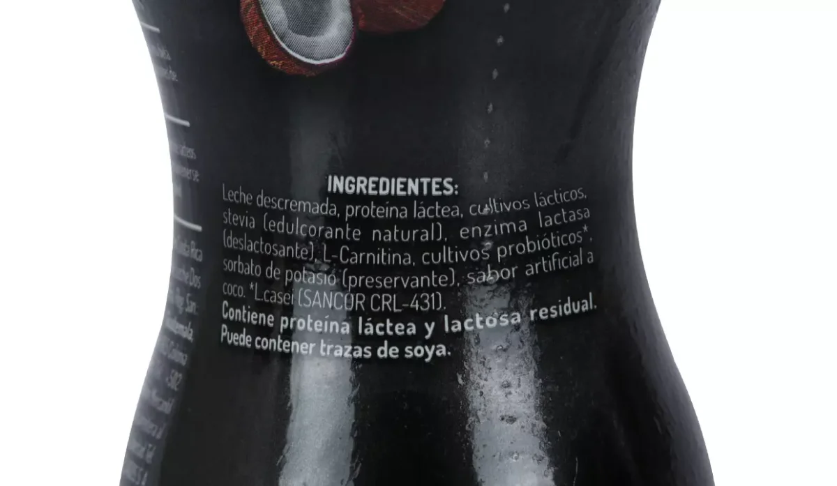 - Leche descremada, proteína láctea, cultivos lácticos, stevia, carnitina y sabor artificial coco.