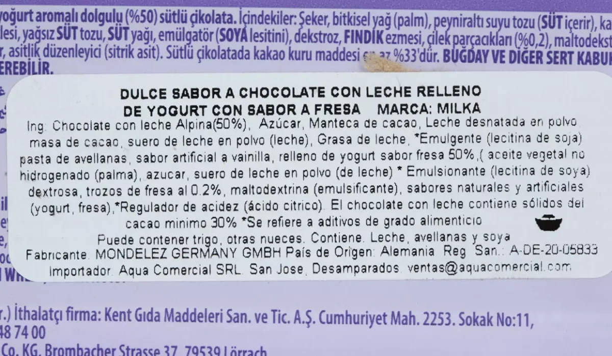 - Chocolate con leche, azúcar, manteca de cacao, leche desnatada en polvo, masa de cacao, grasa de leche, pasta de avellanas, sabor artificial a vainilla, relleno de yogurt.