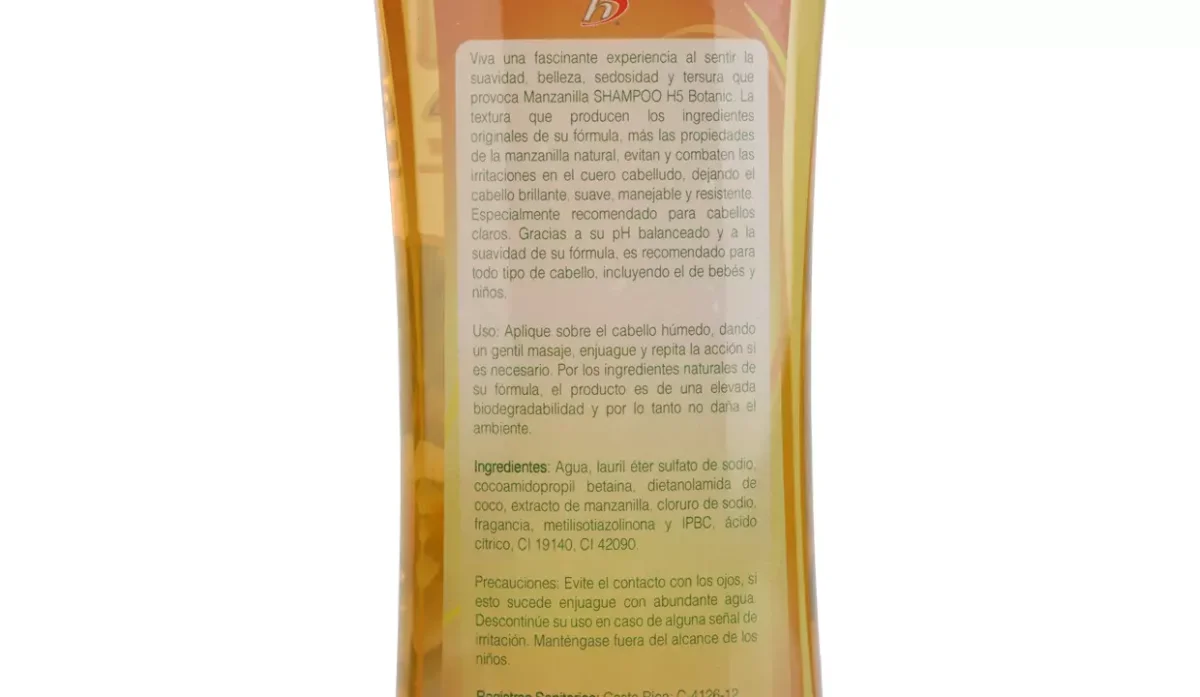 - Agua, lauril eter sulfato de sodio, cocoamidopropil betaina, dietanolamida de coco, extracto de manzanilla, cloruro de sodio, fragancia y ácido cítrico.