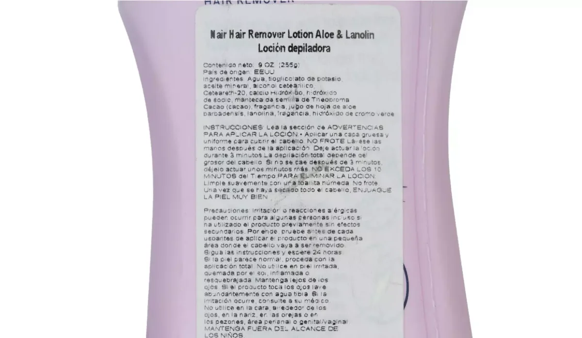 - Agua, tioglicolato de potasio, aceite mineral, alcohol cetearílico, ceteareth-20, calcio hidróxido, hidróxido de sodio, manteca de semilla de tineobroma cacao, fragancia, jugo de hoja de aloe, barbadensis, lanolina, fragancia, hidróxido de cromo verde, aloe vera.