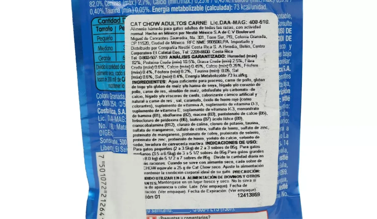 - Agua suficiente para proceso, carne de pollo, gluten de trigo y/o gluten de maíz y/o harina de soya, hígado y/o corazón de pollo, carne de res, almidón de maíz, ortofosfato y/o carbonato de calcio, hígado y/o vísceras de cerdo, saborizante cárnico artificial y natural, sal**, colorantes (caramelo, óxido de hierro rojo), vitaminas (A, D-3, E, K-3, Complejo B, cloruro de colina), cloruro de potasio, taurina, minerales , levadura de cervecería inactiva.