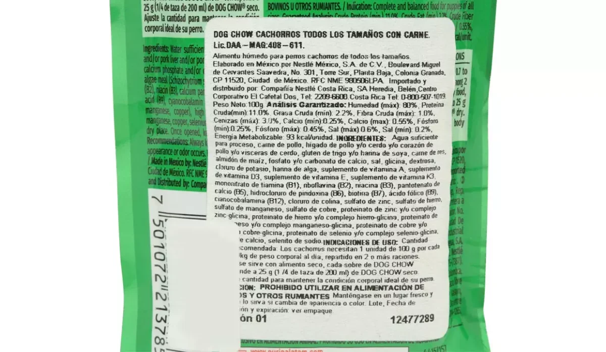 - Agua suficiente para proceso, carne de pollo, hígado y/o corazón de pollo y/o hígado y/o vísceras de cerdo, gluten de trigo y/o harina de soya, carne de res, almidón de maíz, fosfato y/o carbonato de calcio, sal, glicina, dextrosa, cloruro de potasio, harina de alga (Schizochytrium sp.), vitaminas (A, D3, E, K3, mononitrato de tiamina (B1), riboflavina (B2), niacina (B3), pantotenato de calcio (B5), hidrocloruro de piridoxina (B6), biotina (B7), ácido fólico (B9), cianocobalamina (B12), clorur.