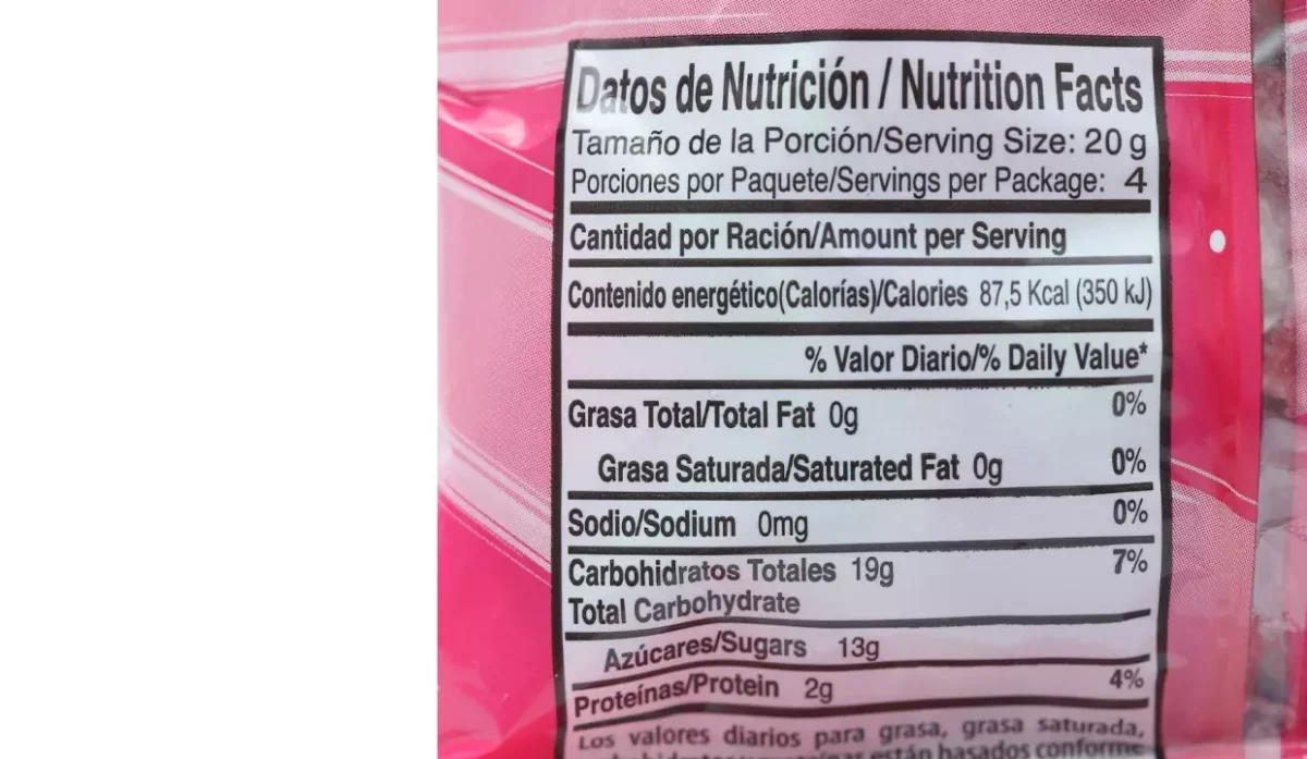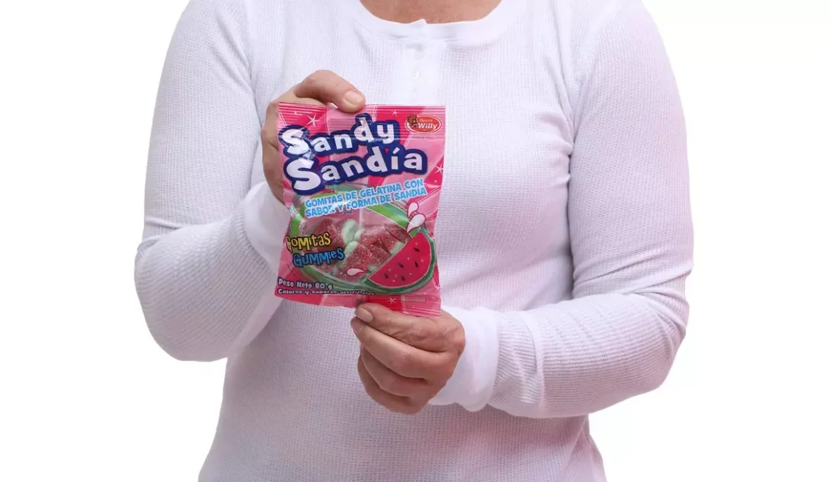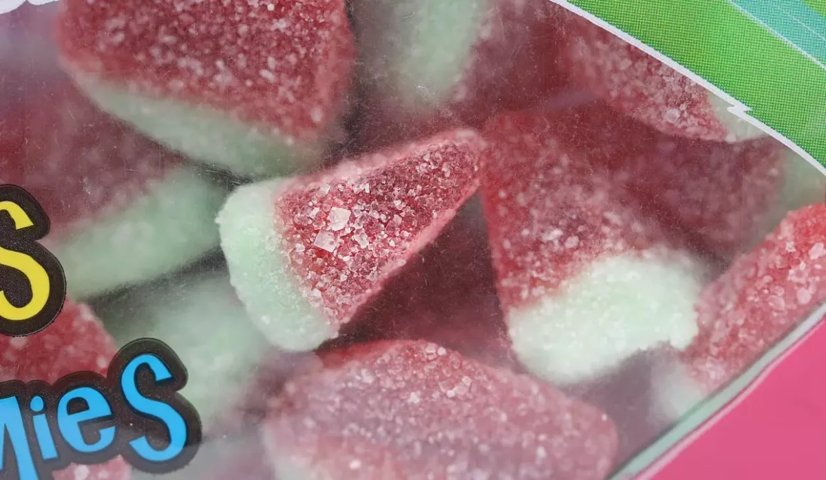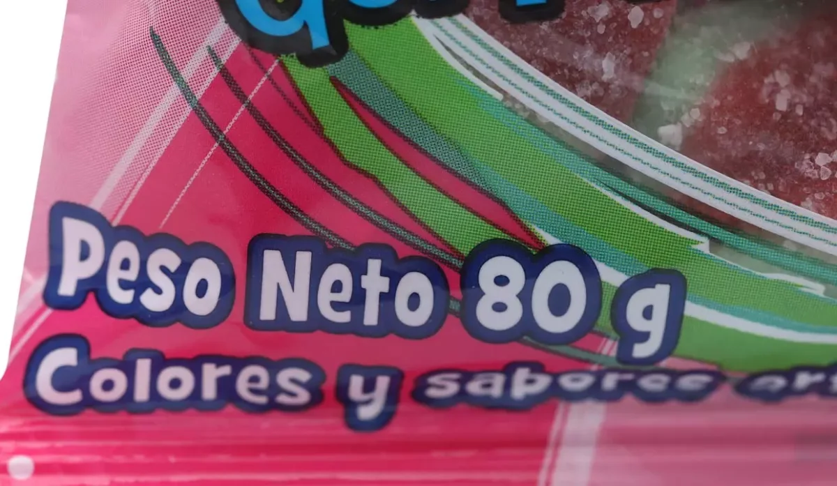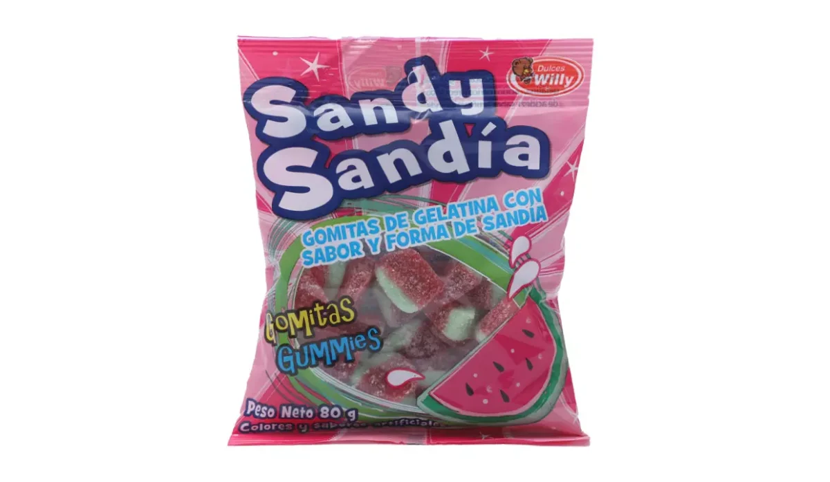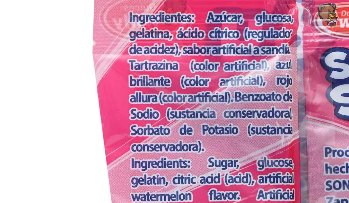 - Azúcar, glucosa, gelatina, ácido cítrico, sabor artificial a sandía, colores artificiales, tartrazina, benzoato de sodio.