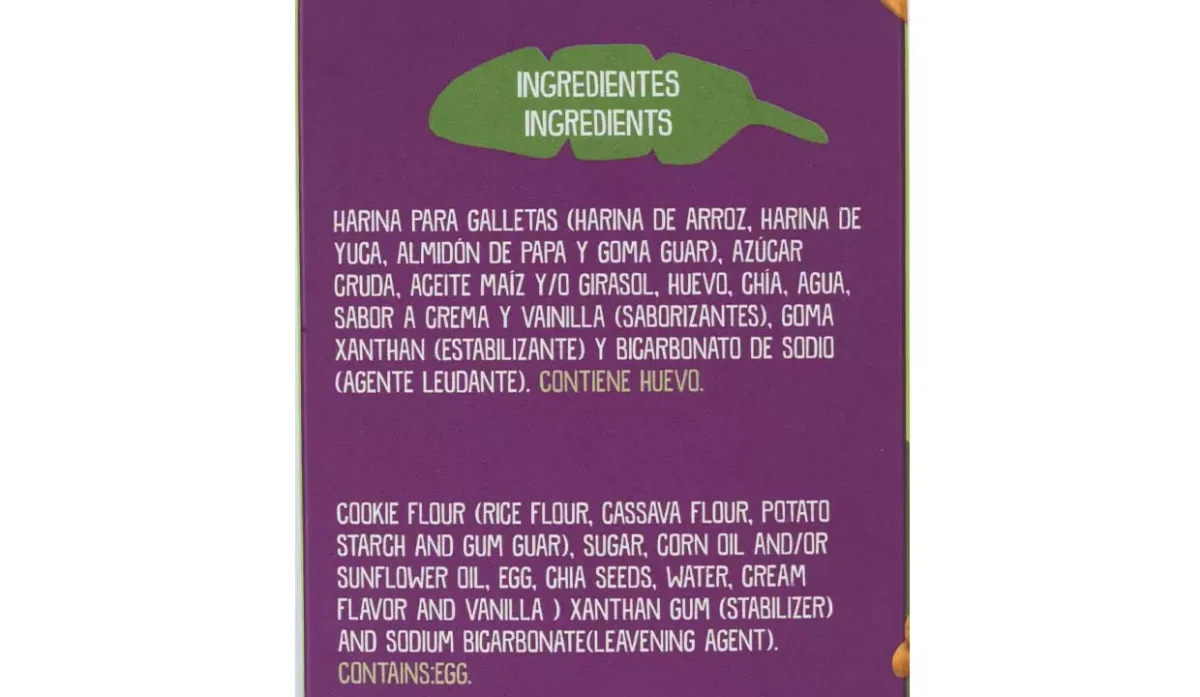- Harina de arroz, harina de yuca, almidón de papa, azúcar cruda, aceite de maíz y/o girasol, huevo, chía, agua, sabor a crema-vainilla y bicarbonato de sodio.