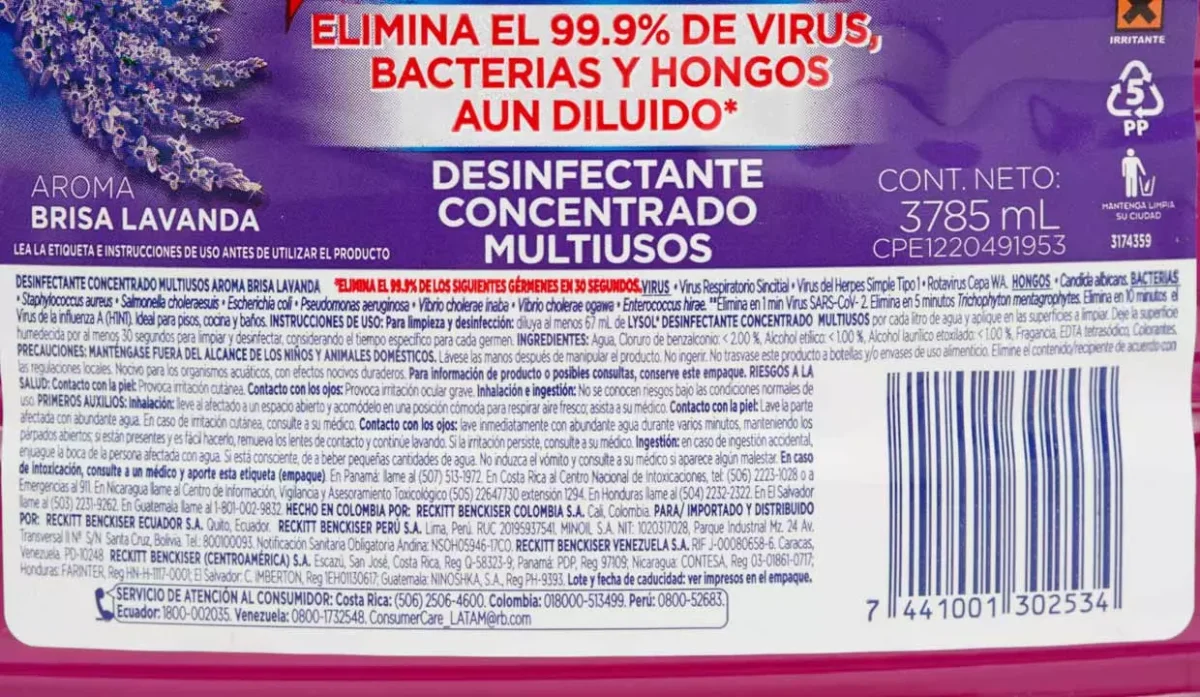 - Elimina el 99.9% de virus bacterias y hongos aun diluido.