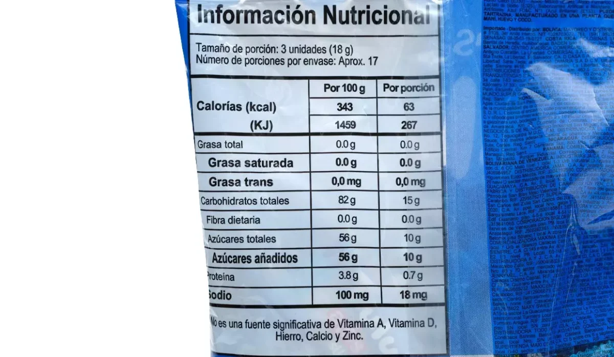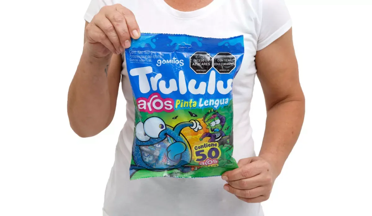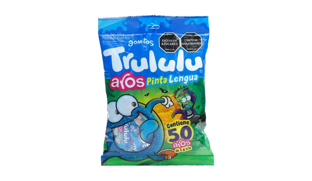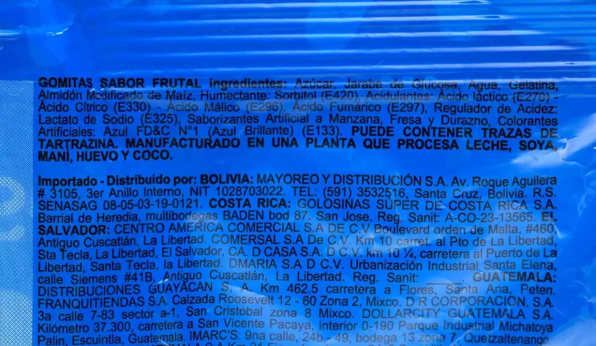 - Azúcar, jarabe de glucosa, agua, gelatina, almidón modificado de maíz, humectante: sorbitol (e420), acidulantes: ácido láctico (e270), ácido cítrico (e330), ácido málico (E296), ácido fumárico (e297), regulador de acidez: lactato de sodio (e325), saborizantes artificial a manzana, fresa y durazno, colorantes artificiales: azul FD&C Nº1 (azul.
