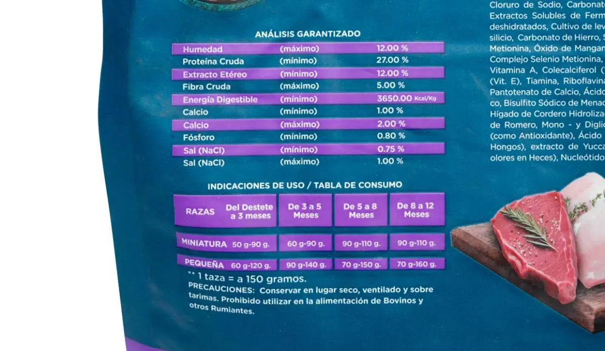 - Magnesio, acetato de vitamina A, colecalciferol vitamina D3, acetato de tocoferol vitamina E, tiamina, riboflavina, piridoxina, cianocobalamina, pantotenato de calcio, ácido fólico, biotina, ácido nicotínico, bisulfito sódico de menadiona vitamina K, cloruro de colina, hígado de cordero hidrolizado, lecitina de girasol, extracto de romero, mono y digliceridos, terbutil hidroquinona, ácido propiónico, extracto de yuca schidigera, nucleótidos.