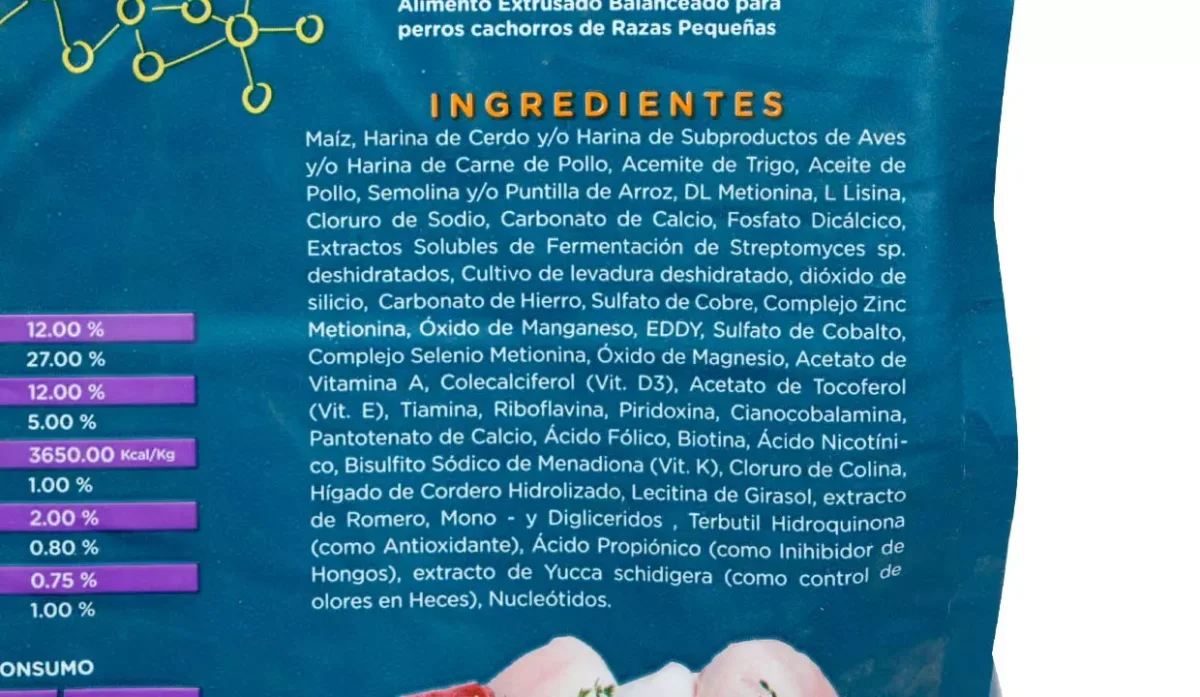 - Maíz, harina de cerdo y/o harina de subproductos de aves y/o harina de pollo, acemite de trigo, aceite de pollo, semolina y/o puntilla de arroz, DL metionina, L lisina, cloruro de sodio, carbonato de calcio, fosfato dicálcico, extractos solubles de fermentación de streptomydes sp deshidratados, cultivo de levadura deshidratada, dióxido de silicio, carbonato de hierro, sulfatode cobre, complejo zinc metionina, óxido de manganeso, eddy, sulfato de cobalto, complejo selenio metionina, óxido de.