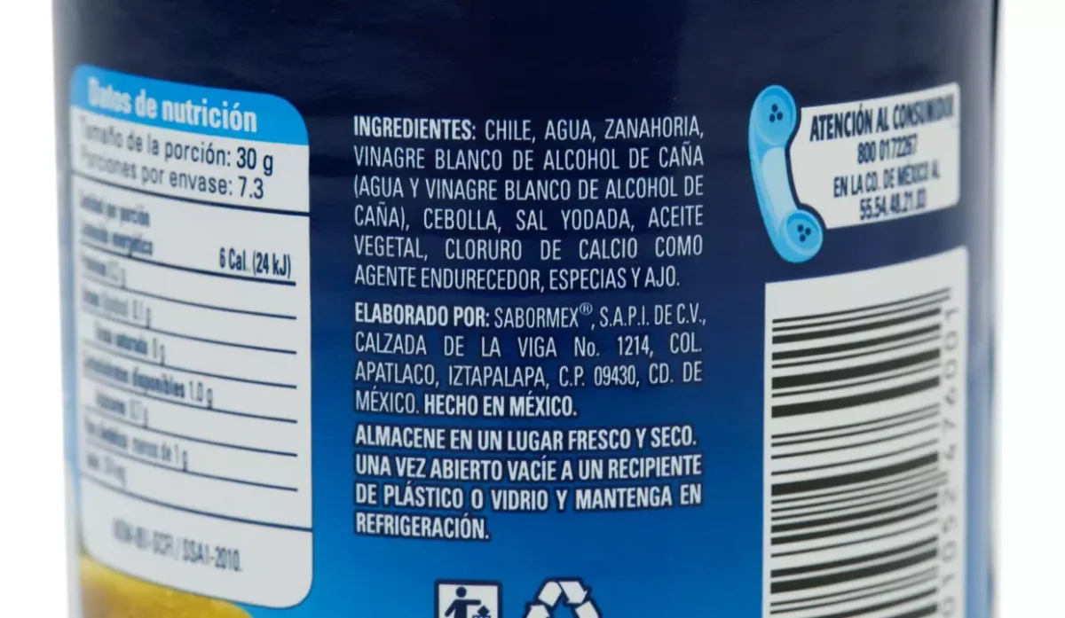 - Chile, agua, zanahoria, vinagre blanco de alcohol de caña, cebolla, sal yodada, aceite vegetal, cloruro de calcio como agente endurecedor, especias y ajo.