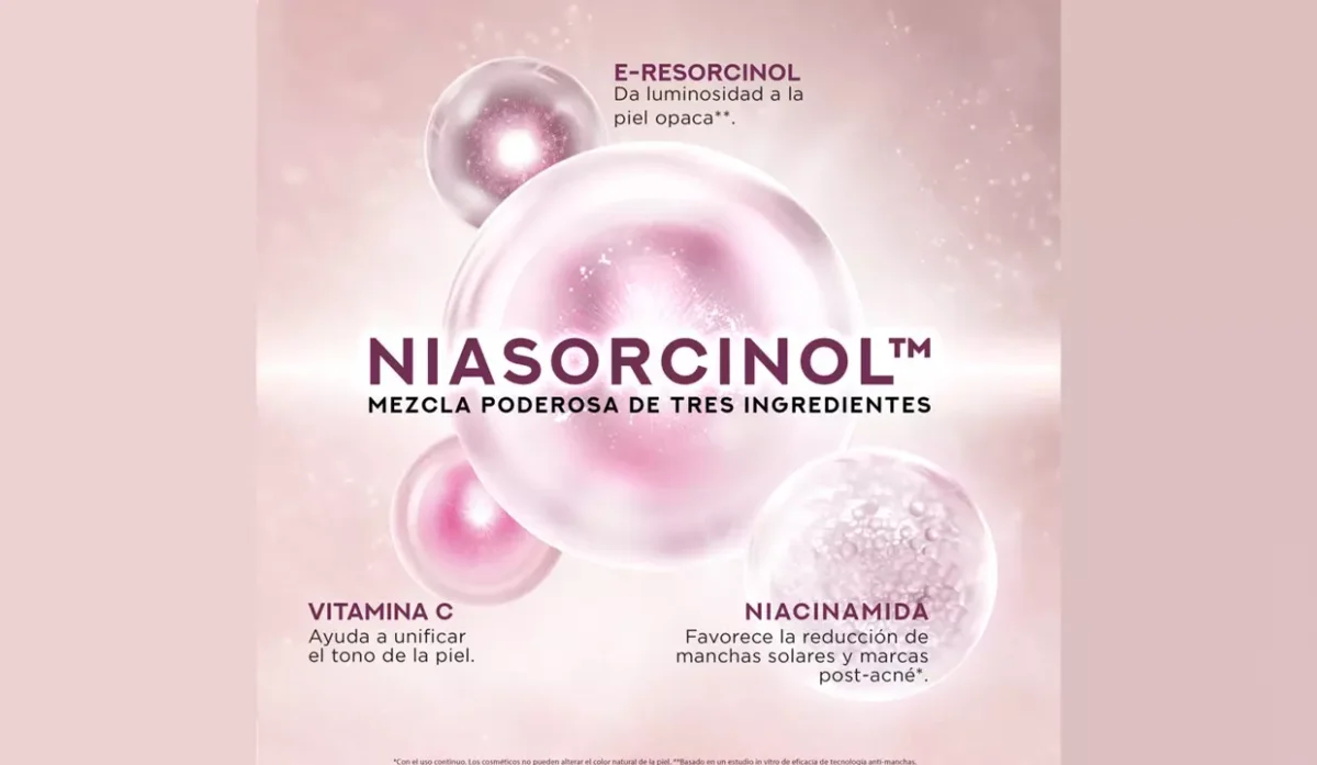 - El E-resorcinol es un ingrediente que impulsa el efecto de la niacinamida para dar luminosidad a la piel opaca.