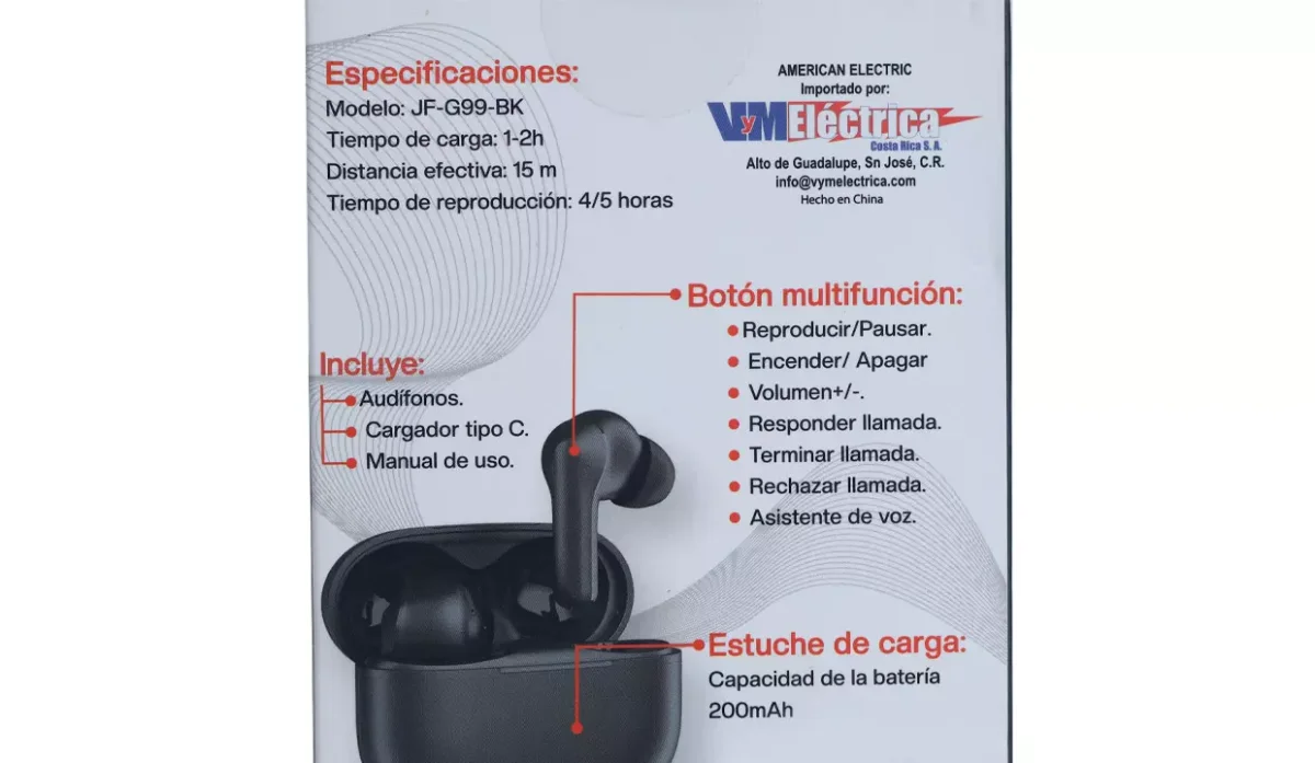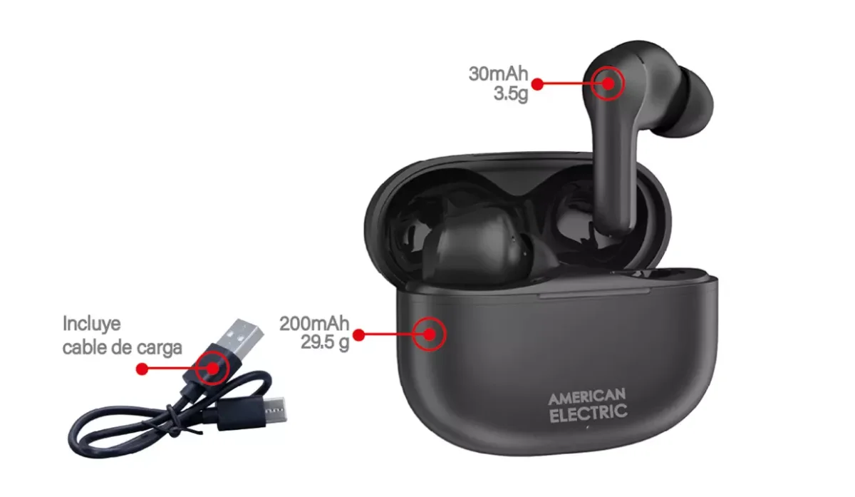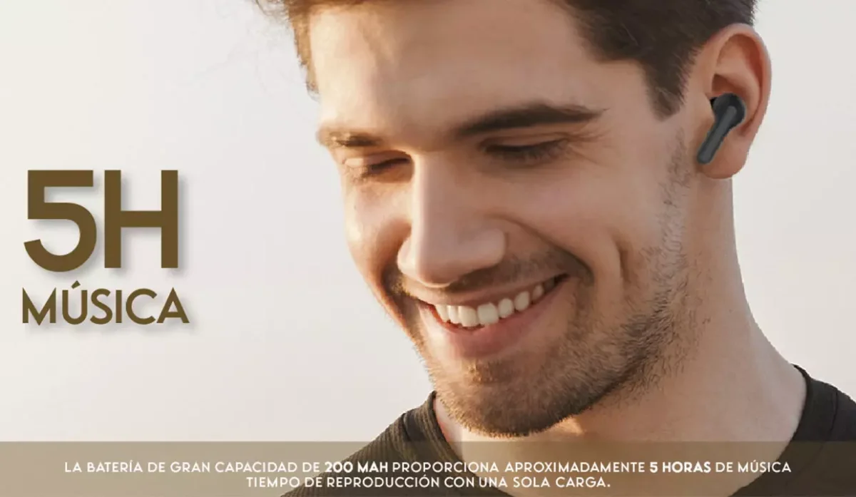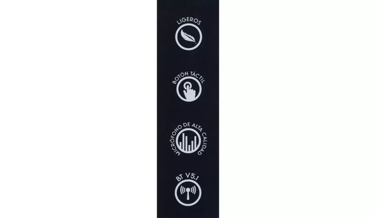 - Botón táctil: reproducir / pausar / encender / apagar / subir y bajar volumen / responder terminar y rechazar llamdas.