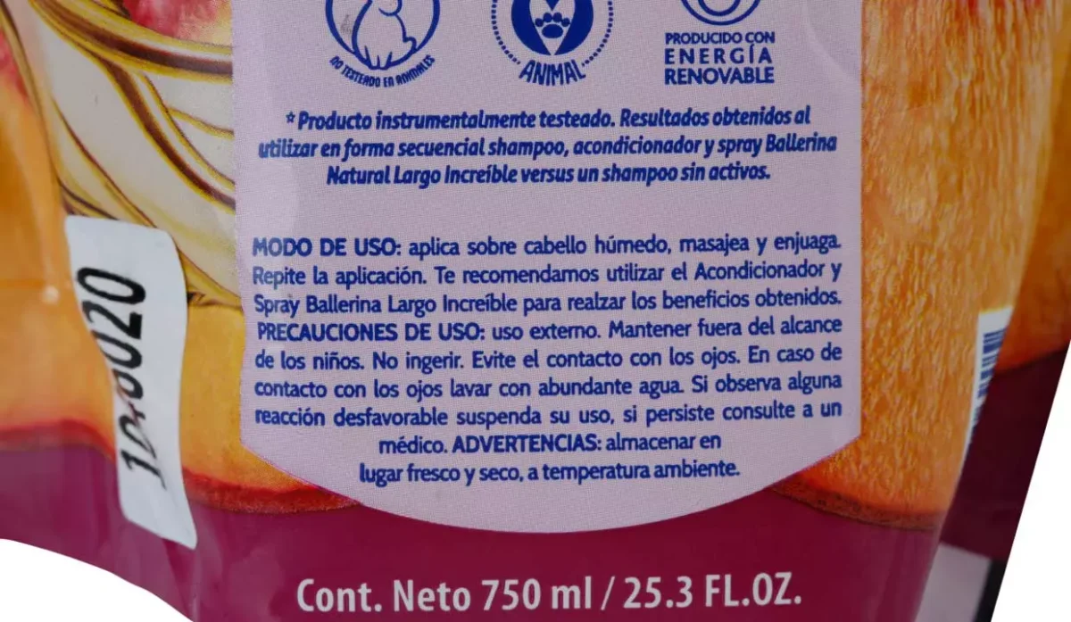 - Agua, alcohol cetílico, cloruro de cetrimonio, dimenticonol, dodecilbencenosulfonato, perfume, metilcloroisotiazolina, metilisotiazolinona, cloruro de magnesio, nitrato de magnesio, amodimeticona, Tricedeth 12, ácido cítrico, proteína de soja hidrolizada, proteína de maíz hidrolizada, proteína de trigo hidrolizada, aceite de semilla de Simmondsia chinensis (jojoba), propilenglicol, extracto de fruto de Prunus persica (durazno).