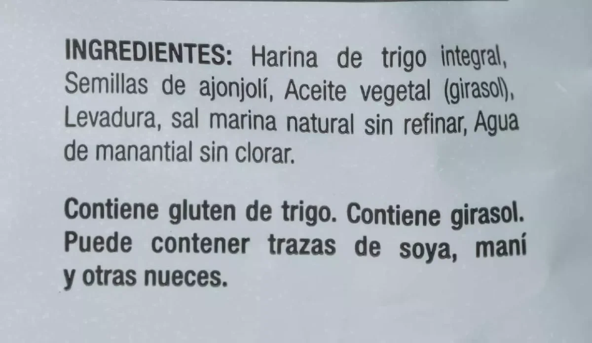 - Harina de trigo integral, semillas de ajonjolí, aceite vegetal (girasol), levadura, sal marina natural sin refinar y agua de manantial sijn clorar.